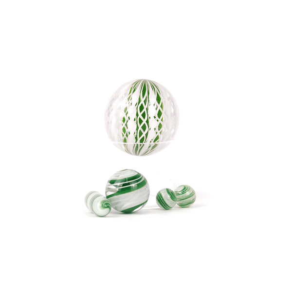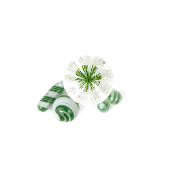 ARTIST: Harold CooneyVALVE SIZE: 13mmMARBLE SIZE: 23mmPILL SIZE: 6mm x 17.5mmPEARL SIZE: 7mmCOLOR: Green & White Zanfirico