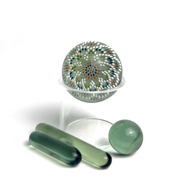 ARTIST: Joe Howe - JH GlassVALVE SIZE: 11mmMARBLE SIZE: 20mmPILL SIZE: 5mm x 21mm, 5mm x 32mmCOLOR: Hydra (Purple to Green), Rainbow Dotwork
