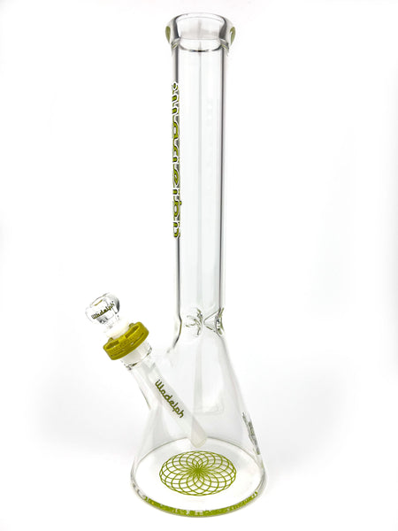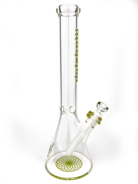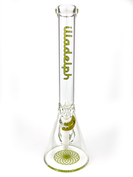 ARTIST: IlladelphHEIGHT: 15.5"BASE DIAMETER: 5"JOINT SIZE: 14mm 45ºCOLORS: Clear, White Downstem, Lime Label