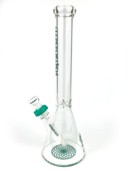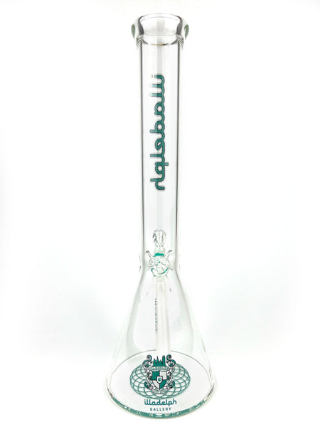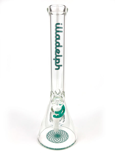 ARTIST: IlladelphHEIGHT: 15.5"BASE DIAMETER: 5"JOINT SIZE: 14mm 45ºCOLORS: Clear, White Downstem, Teal Label