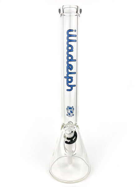 ARTIST: IlladelphHEIGHT: 19"BASE DIAMETER: 5.5"JOINT SIZE: 14mm 45ºCOLORS: Clear, White Downstem, Navy Label