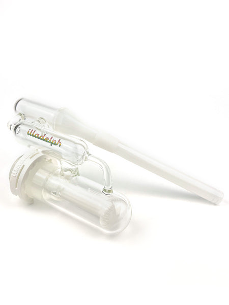 ARTIST: IlladelphJOINT SIZE: 14mm 45º to 14mm 90º (Fits Full Size Illadelphs)COLORS: White, Clear, Rasta Label