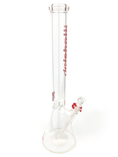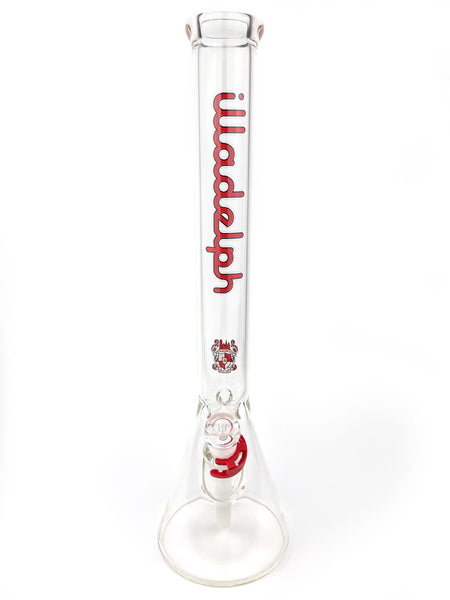 ARTIST: IlladelphHEIGHT: 19"BASE DIAMETER: 5"JOINT SIZE: 14mm 45ºCOLORS: Clear, White Downstem, Red Label