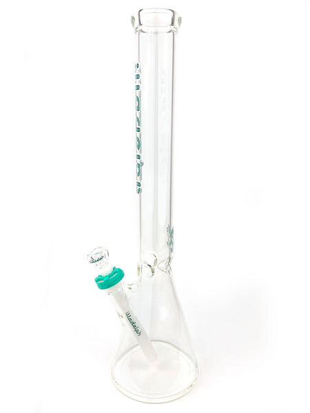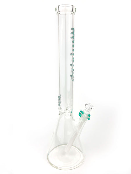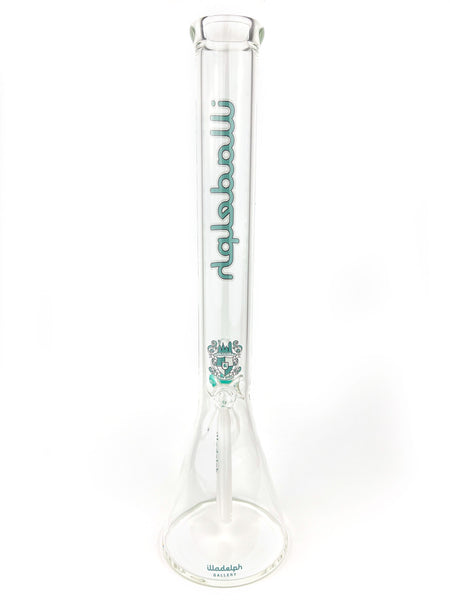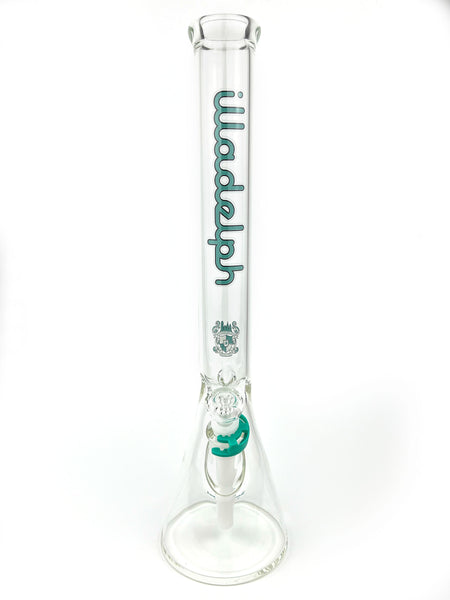 ARTIST: IlladelphHEIGHT: 19"BASE DIAMETER: 5"JOINT SIZE: 14mm 45ºCOLORS: Clear, White Downstem, Teal Label