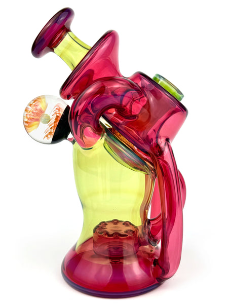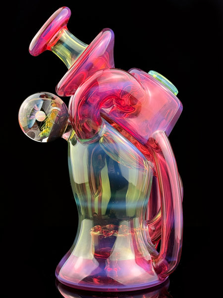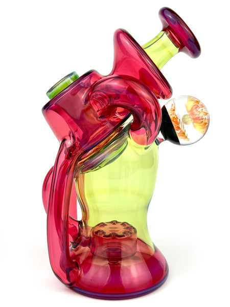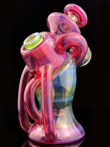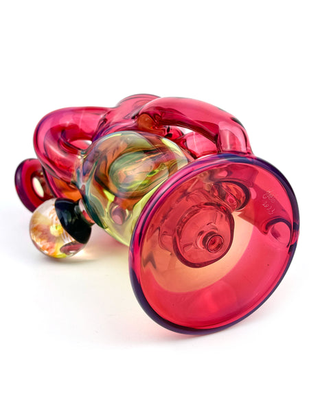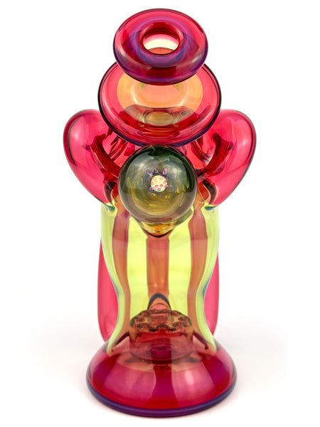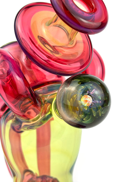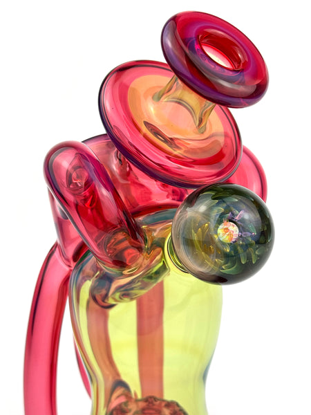 ARTIST: KeeloHEIGHT: 7.5"BASE DIAMETER: 3.25"JOINT SIZE: 14mm 45ºCOLORS: Telemagenta over Gold Ruby, Moonstone over Limestone, Fume Implosion, Opal Sphere