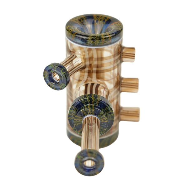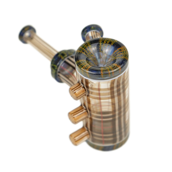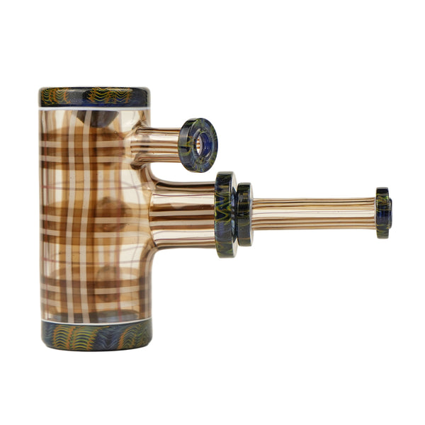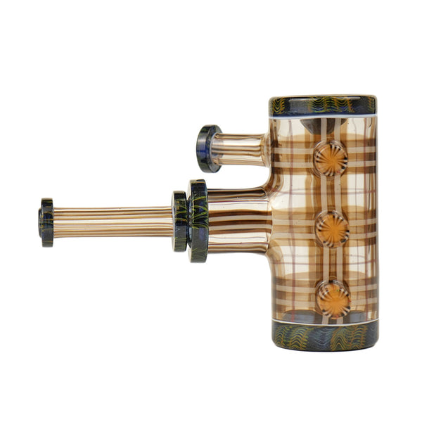 ARTIST: Scolari x BLitCOLOR: Brown, White & Red Scolari Tartan Tech with accents of BLit Gold & Silver Fume work over heavy blue stardust SIZE: 5"