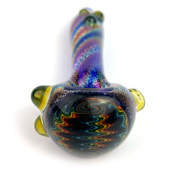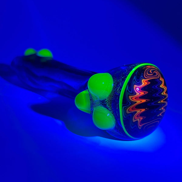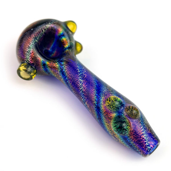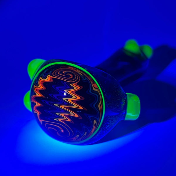 ARTISTS: Eric Lang, C Mau GlassCOLORS: Rainbow Dichro over Cobalt, Rainbow Wig Wag, Citrine (UV)SIZE: 4"