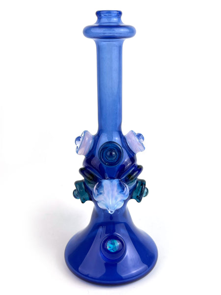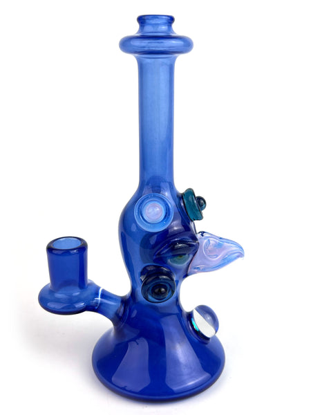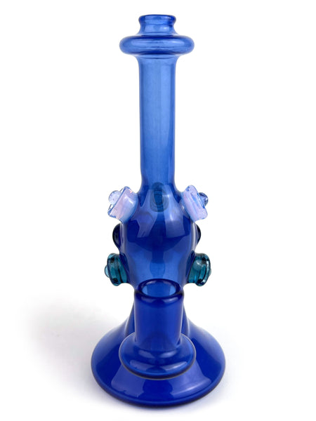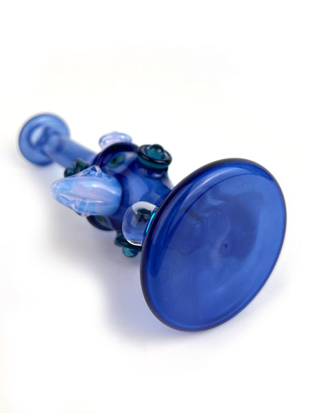 ARTIST: Jacob Lee - Creep Glass HEIGHT: 5.5" BASE DIAMETER: 2" JOINT SIZE: 10mm 90º COLORS: Blue Stardust over Blue Cheese, Lucid, Blue Stardust, Opal Coin