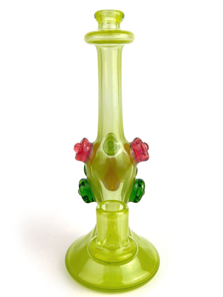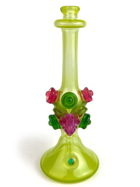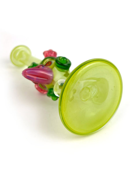 ARTIST: Jacob Lee - Creep Glass HEIGHT: 5.5" BASE DIAMETER: 2" JOINT SIZE: 10mm 90º COLORS: Green Stardust over Roswell, Green Stardust, Portland Green, Karmaline, Opal Coin