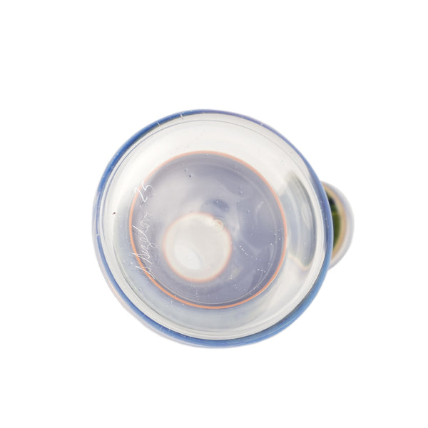 ARTIST: Steve SizeloveHEIGHT: 2 5/8"BASE DIAMETER: 2 3/16"JOINT SIZE: 10mm 90ºCOLORS: Moonstone, Orange Lip Wraps & fumed bubble trap
